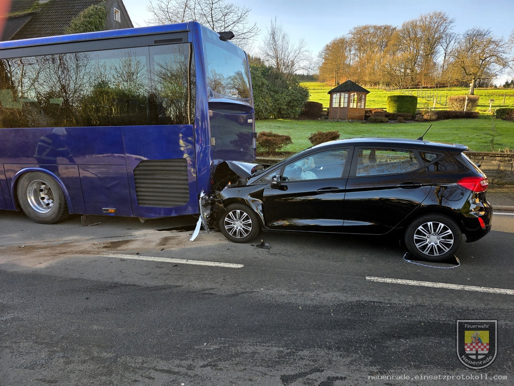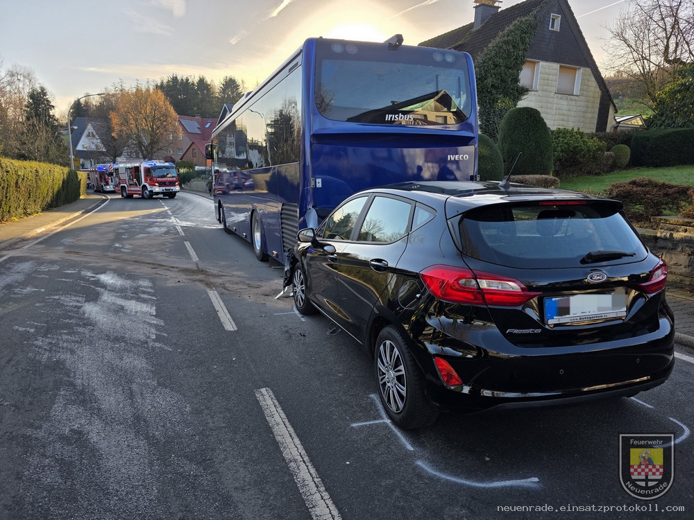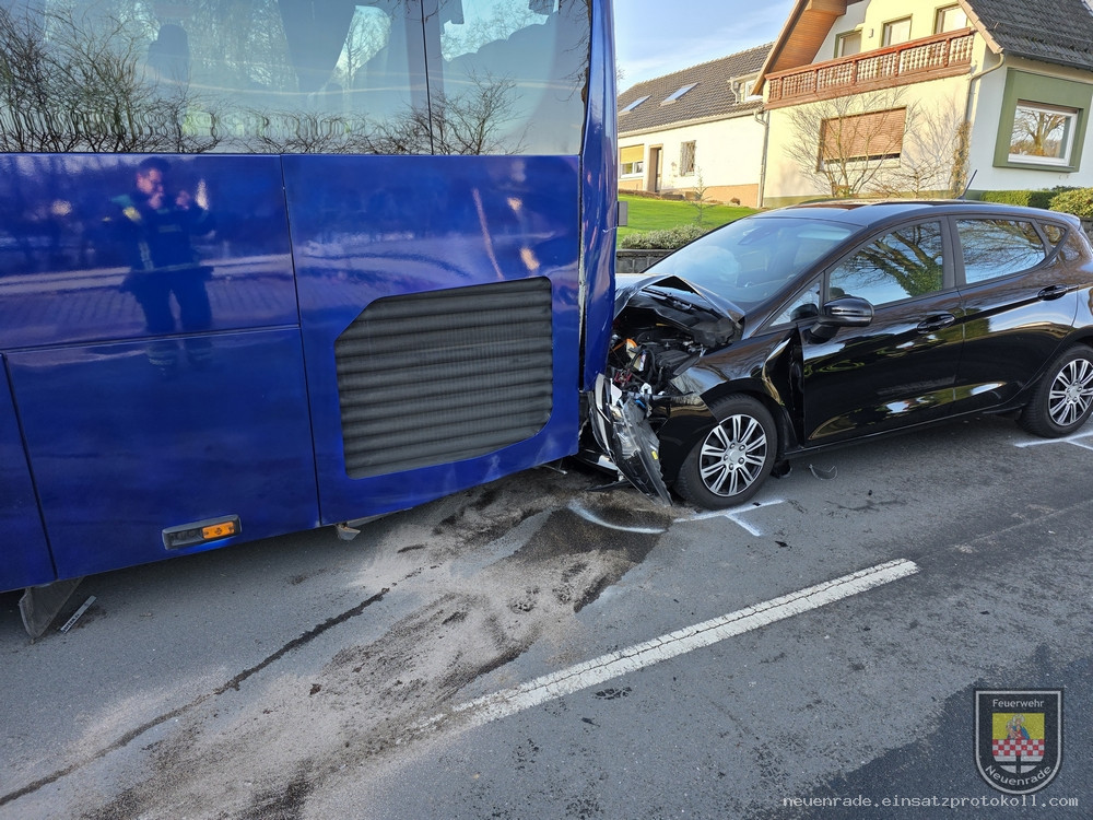 Ein in Richtung Zentrum fahrender PKW prallte nahezu ungebremst auf einen auf der Straße geparkten Reisebus. Eine Person aus dem PKW verletzte sich bei dem Aufprall schwer.